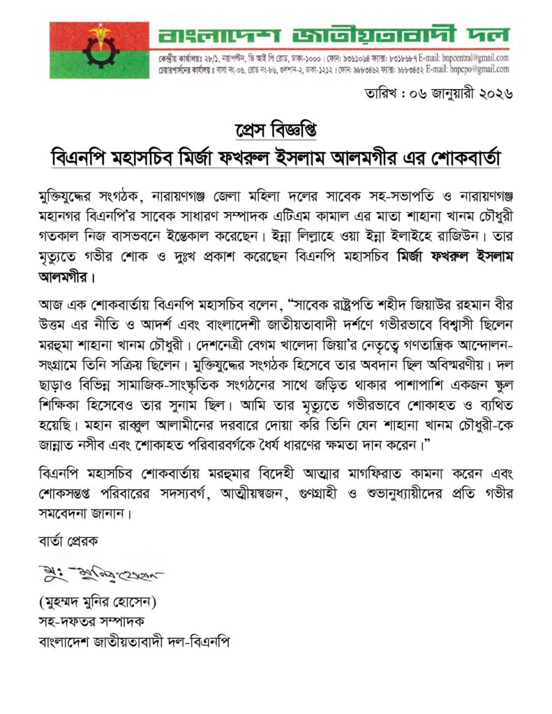 Condolence Message from Mirza Fakhrul Islam Alamgir on the Passing of Shahana Khanam Chowdhury | 06 January 2026